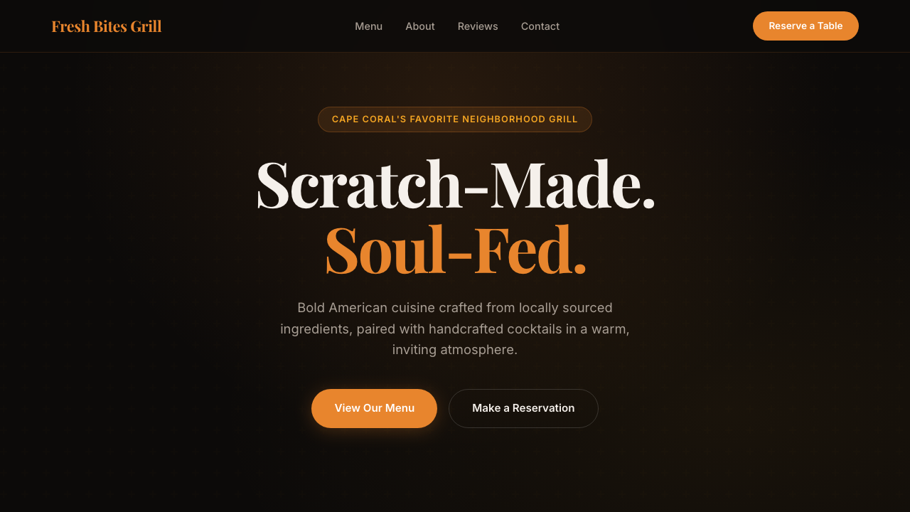 Full menu, reservation form, reviews, and location — designed to fill tables